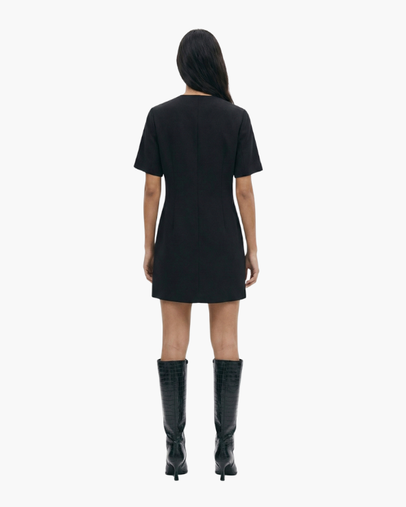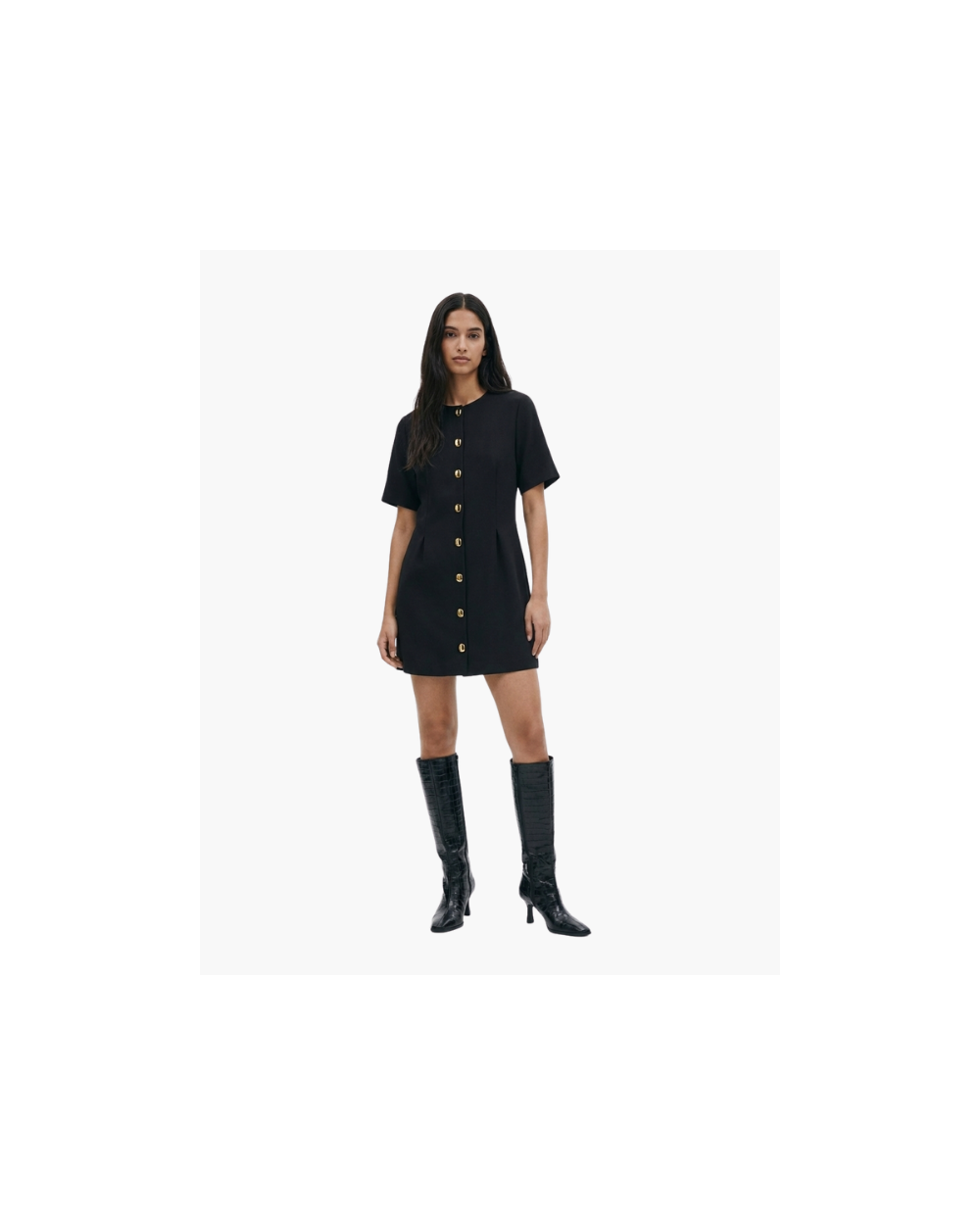 Robe courte en matière tissée. Modèle à manches courtes avec encolure ronde et fermeture par boutons en métal devant. Taille cintrée avec pinces devant et dans le dos. Non doublée.